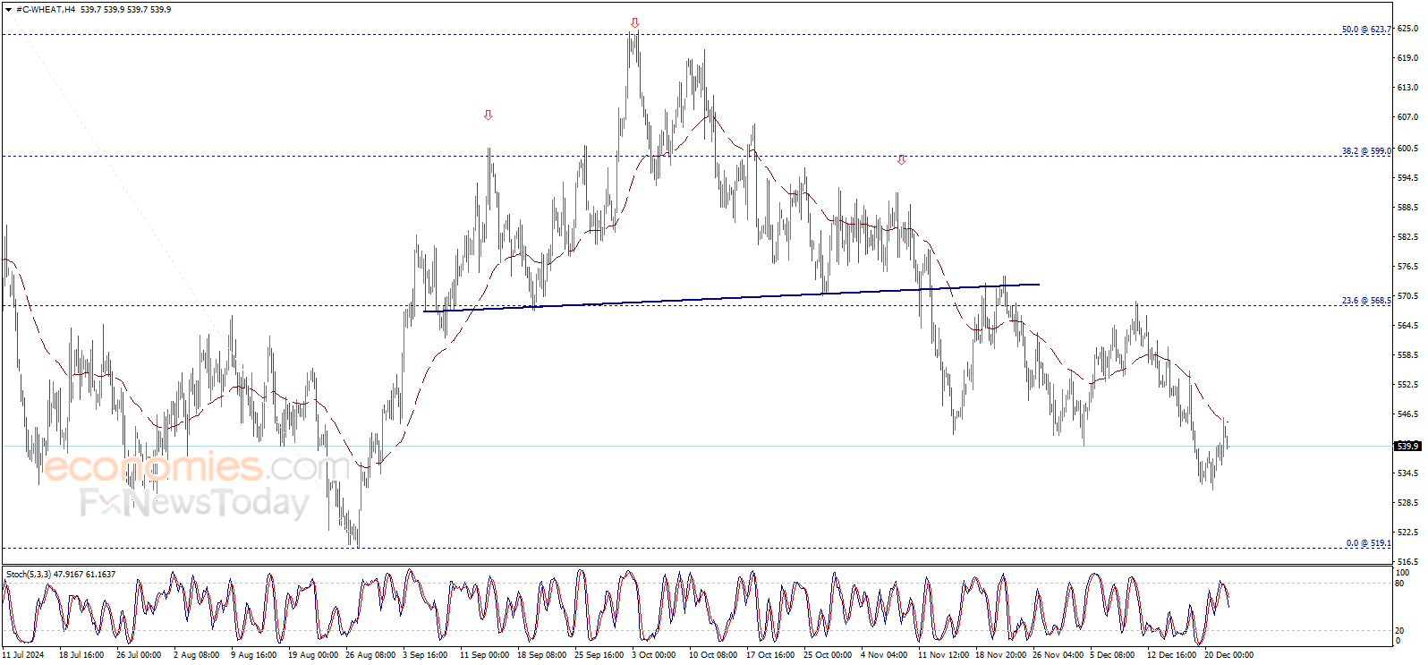 قدّم سعر القمح تداولات إيجابية مؤقتة يوم أمس ليختبر المتوسط المتحرك 50 الذي شكّل مقاومة جيدة أمام السعر، ليرتد هبوطاً ويتجه نحو استئناف الاتجاه الهابط المتوقع للفترة القادمة، بانتظار التوجه نحو مستوى 519.10$ كهدف رئيسي تالي.