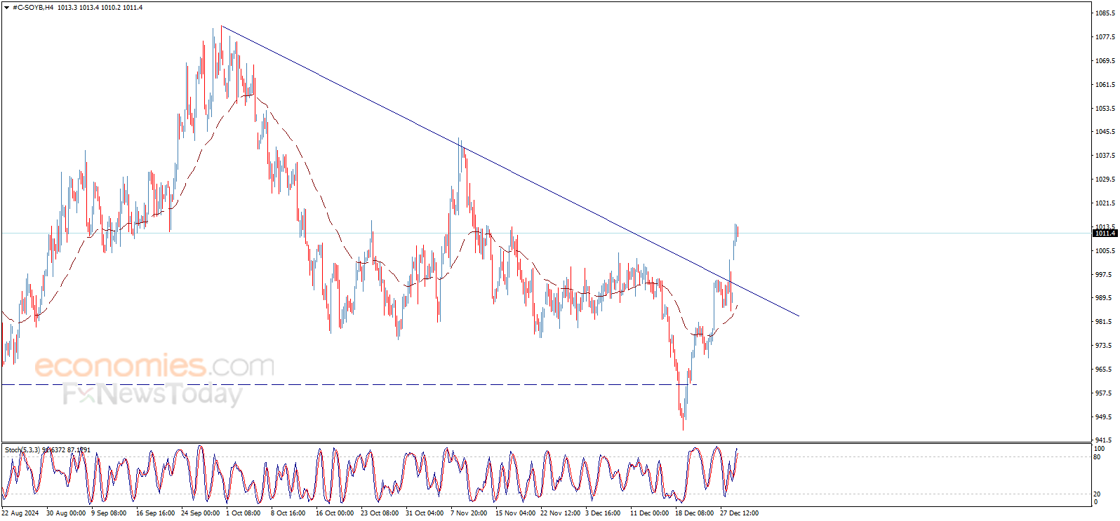 اندفع سعر فول الصويا صعوداً بشكل قوي في الجلسات الماضية ليخترق مستوى 1000.00$ ويفعّل السيناريو الإيجابي على المدى اللحظي، في طريقه لتحقيق مكاسب تتجاوز 1015.00$ لتصل إلى 1030.00$ على المدى القريب.