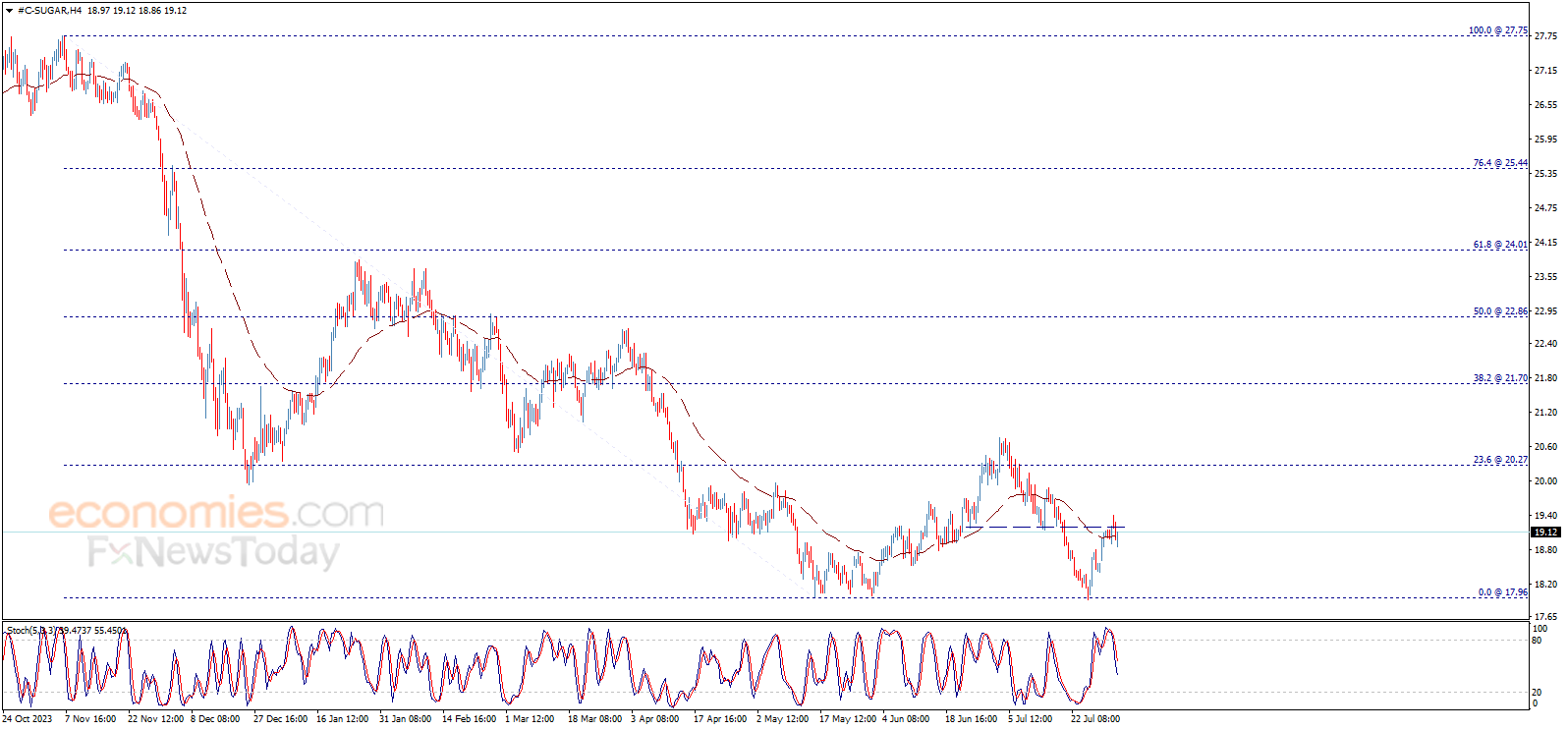 أجرى سعر السكر اختباراً لمستوى 19.20$ وتماسك دونه، ونلاحظ أن مؤشر ستوكاستيك يقدّم إشارات سلبية الآن، ليدعم فرص الارتداد هبوطاً والتوجه لتحقيق أهداف سلبية تصل إلى 17.96$.