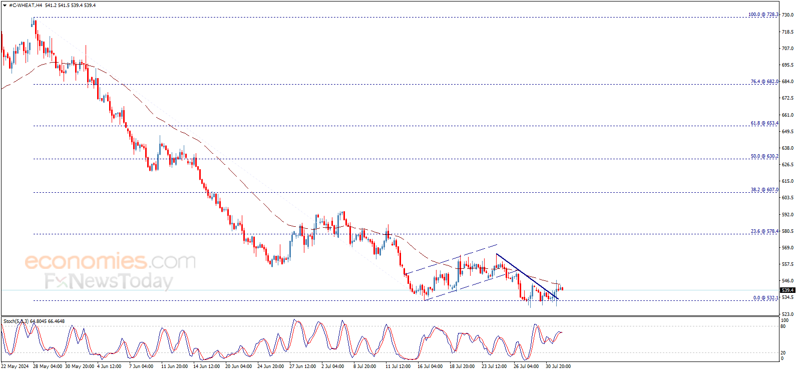 قدّم سعر القمح تداولات إيجابية يوم أمس ليختبر المتوسط المتحرك 50 الذي يشكّل مقاومة جيدة أمام السعر، يرافقه فقدان مؤشر ستوكاستيك للعزم الإيجابي بشكل ملحوظ، بانتظار استئناف الموجة الهابطة التي تبدأ أهدافها بكسر 532.10$ لفتح الطريق أمام التوجه نحو مستويات 515.00$ ثم 500.00$.