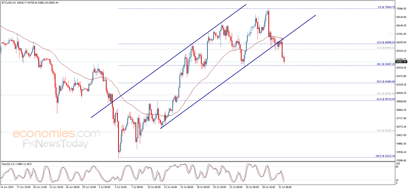 حقق سعر البتكوين (BTCUSD) كسراً قوياً لدعم القناة الصاعدة ليبدأ تصحيح هابط للارتفاع الذي بدأ من مناطق 53323.35$، ويختبر مستوى تصحيح فيبوناتشي 38.2% الآن عند 63657.20$، مع الإشارة إلى أن كسره سيدفع السعر لزيارة مستوى 61684.05$ بشكل مباشر.