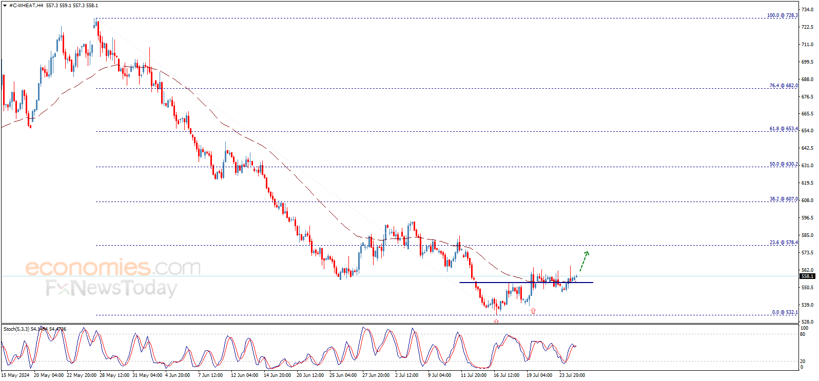 تستقر تداولات سعر القمح فوق 553.40$، ليبقى التأثير الإيجابي لنموذج القاع المزدوج فعالاً، بانتظار استئناف الموجة الصاعدة التي يتواجد هدفها التالي عند 578.40$.