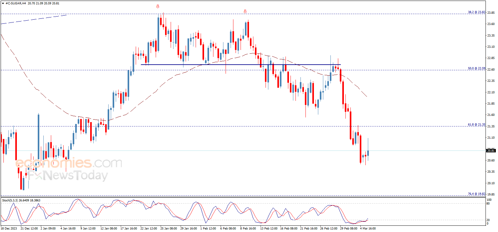 قدّم سعر السكر تداولات إيجابية مؤقتة يوم أمس ويعود للتذبذب دون حاجز 21.00، ليبقى سيناريو الاتجاه الهابط فعالاً على المدى اللحظي والقصير، يدعمه الضغط السلبي الذي يشكّله المتوسط المتحرك 50، بانتظار استهداف مستوى 19.82 بشكل رئيسي.