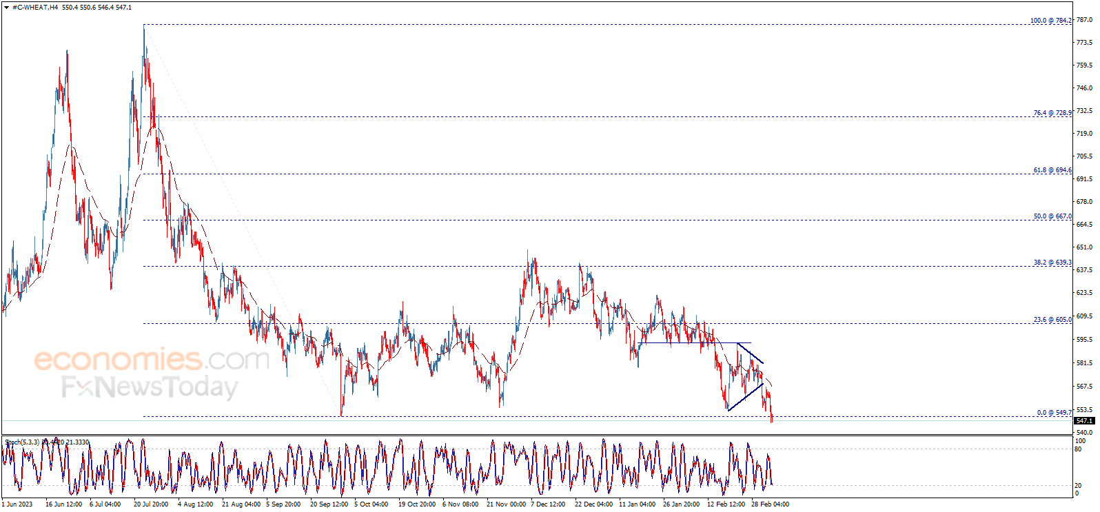 تمكّن سعر القمح من تحقيق هدفنا الأول المنتظر عند 549.70، ويبدأ اليوم بانخفاض جديد ليكسر هذا المستوى ويحاول الثبات دونه، معززاً فرص استمرار الاتجاه الهابط المتوقع على المدى اللحظي والقصير، مع الإشارة إلى أن هدفنا التالي يصل إلى 540.00.