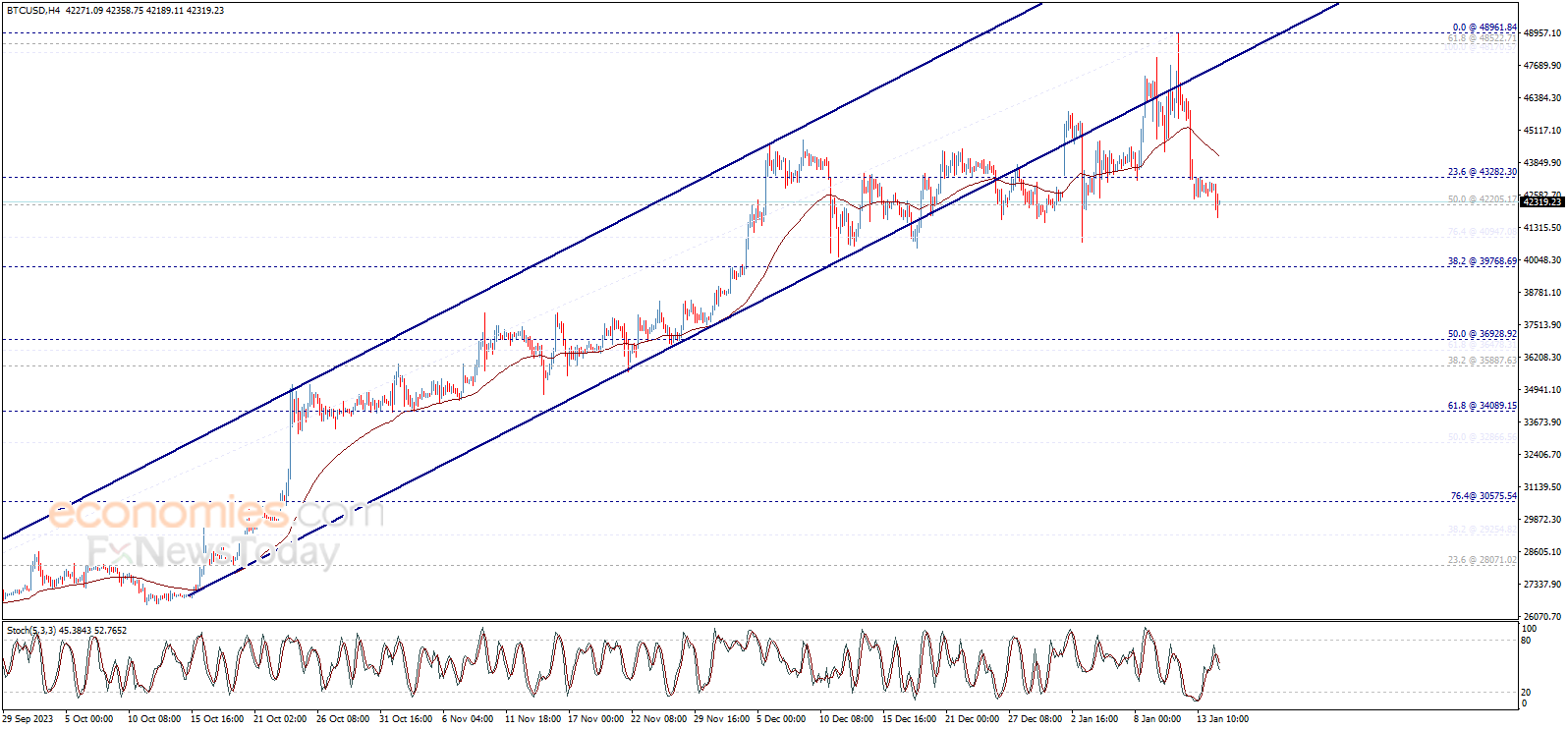 وبالتالي، نحن نتوقّع أن نشهد تداولات سلبية إضافية خلال الجلسات القادمة بدعم من الضغط السلبي الذي يشكّله المتوسط المتحرك 50، مع الانتباه إلى أن اختراق 43282.30 سيوقف الانخفاض المتوقع ويقود السعر لمحاولة استعادة الاتجاه الرئيسي الصاعد من جديد.