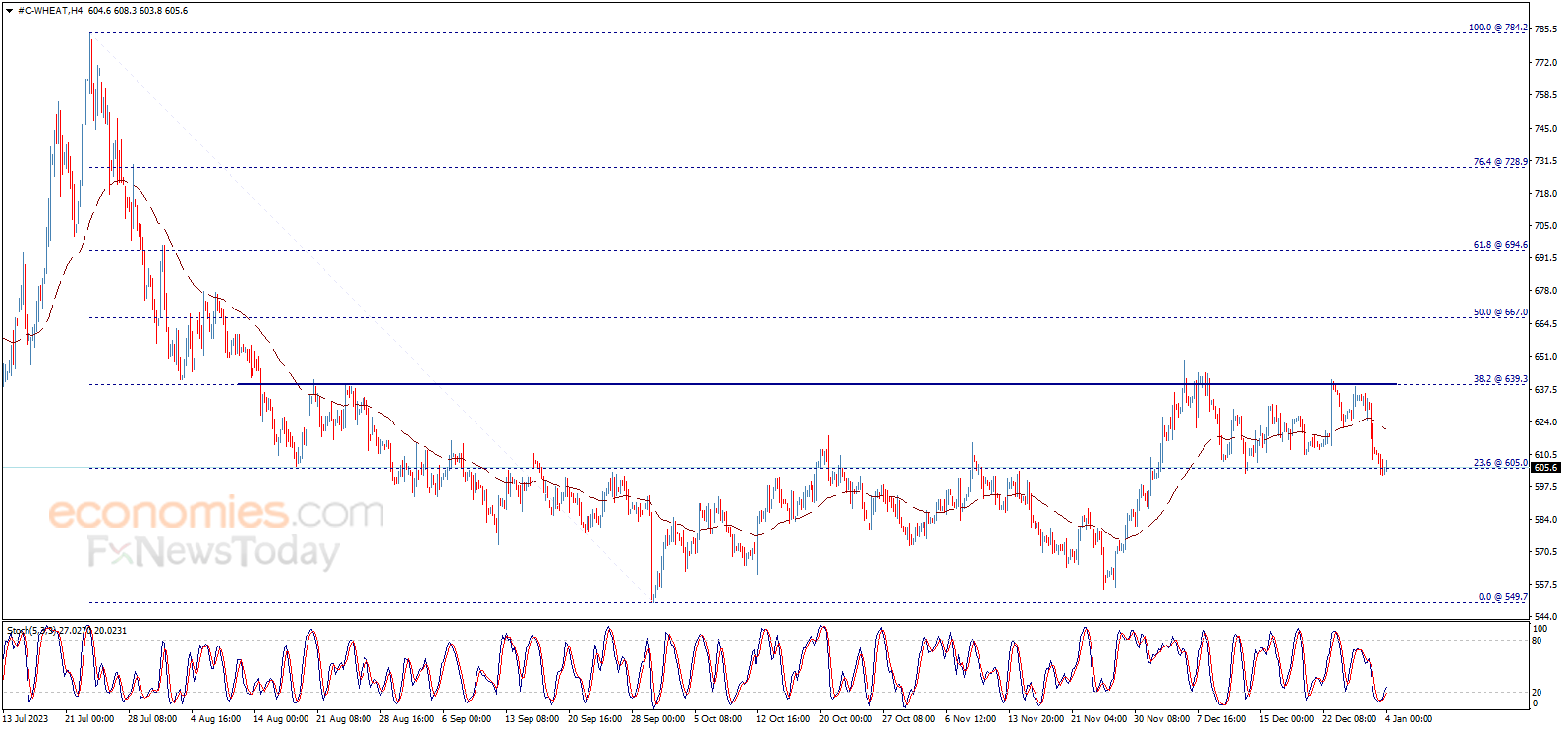 لامس سعر القمح مستوى 605.00 واستقر عنده، ويبدأ مؤشر ستوكاستيك بفقدان العزم الإيجابي بشكل تدريجي، بانتظار تحفيز السعر على استئناف الموجة الهابطة التي تمتد أهدافها السلبية لتصل إلى 589.00.