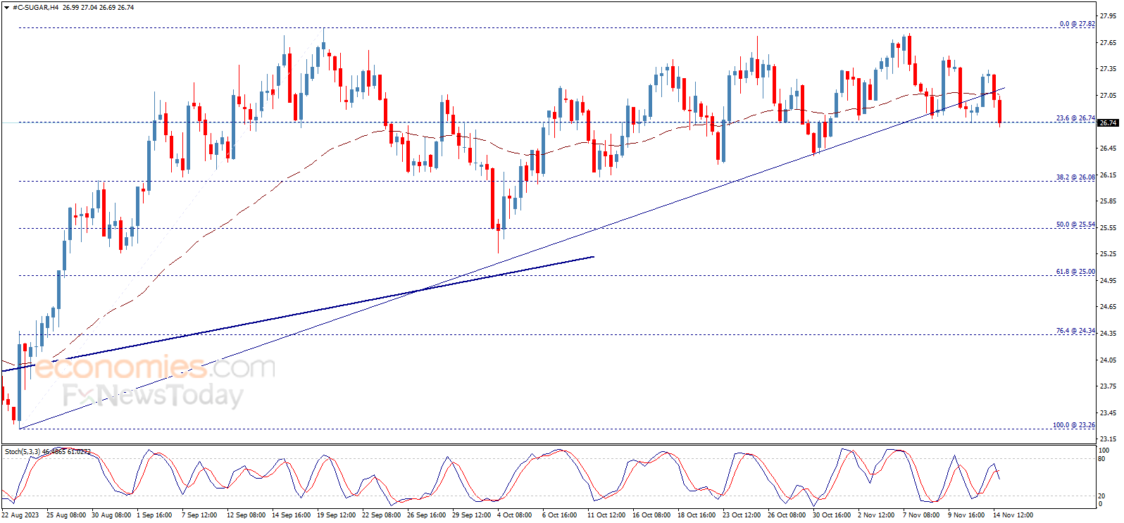 يعود سعر السكر للانخفاض واختبار الدعم المحوري 26.74، مما يتطلب الانتباه من التداولات القادمة، حيث يحتاج السعر للتماسك فوق هذا المستوى ليبقى سيناريو الاتجاه الصاعد فعالاً، والذي يستهدف مستوى 27.82 كمحطة رئيسية تالية.