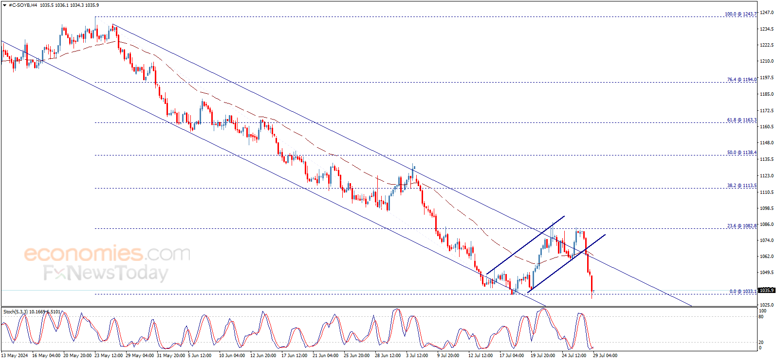 ارتدت تداولات سعر فول الصويا هبوطاً بشكل قوي ليكسر مستوى 1064.20$ ويعود إلى المسار الهابط من جديد، حيث لامس مستوى 1033.10$ ووجد دعم قوي هناك، ونرجّح استئناف التداولات السلبية لكسر هذا المستوى وتحقيق أهداف سلبية إضافية تصل إلى مناطق 1000.00$ ثم 985.00$ كمحطات رئيسية تالية.