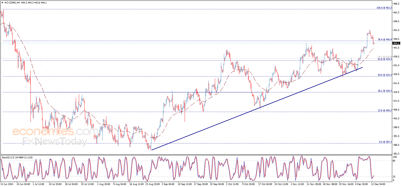 واجه سعر الذرة ضغط سلبي يوم أمس ليكسر مستوى 445.40$ ويستقر دونه، ليوقف السيناريو الإيجابي المقترح في تقاريرنا الأخيرة ويقع تحت ضغط سلبي متوقّع خلال الجلسات القادمة، مستهدفاً زيارة مناطق 434.30$ بشكل رئيسي.