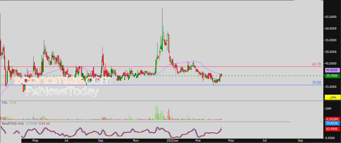 لهذا فتوقعاتنا ترجح عودة هبوط سعر السهم خلال تداولاته القادمة، طيلة ثبات مستوى المقاومة 43.70 دينار، ليستهدف مستوى الدعم المحوري 35.80 دينار.