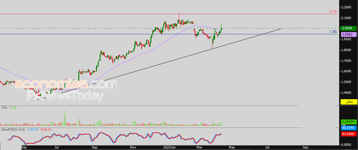 لذلك تشير توقعاتنا إلى استمرار صعود سعر السهم خلال تداولاته القادمة، طيلة استقراره أعلى مستوى 1.95 ريال، ليستهدف مستوى المقاومة المحوري 2.14 ريال.