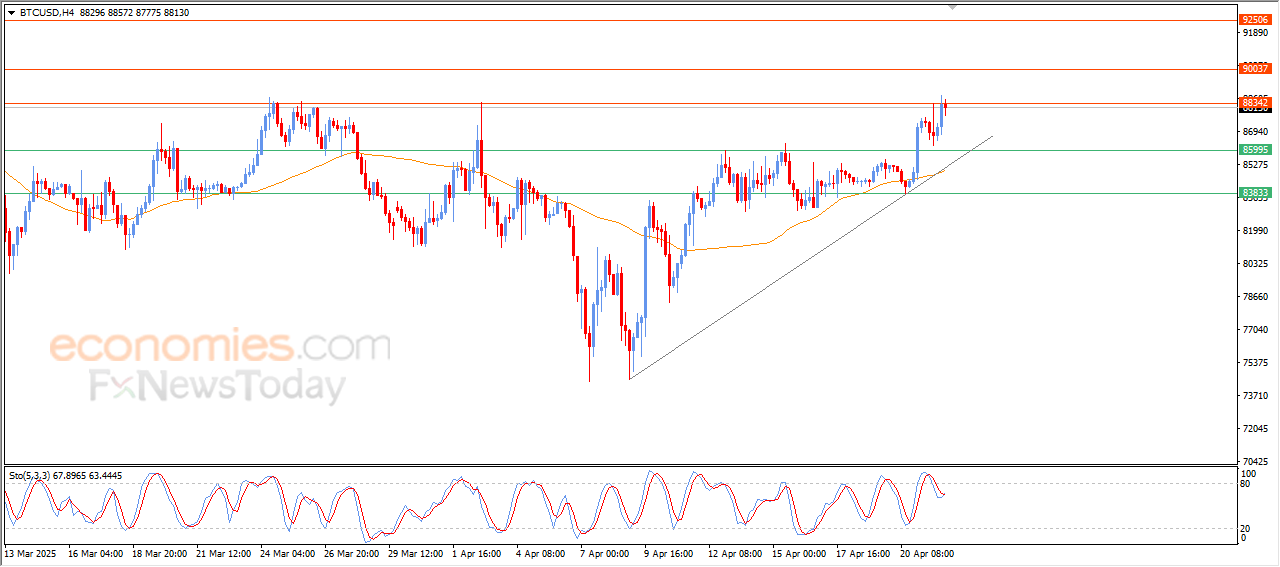 تراجع قليلاً سعر البتكوين (BTCUSD) بتداولاته اللحظية الأخيرة، وذلك على اثر ثبات مستوى المقاومة المحوري والعنيد 88,300$، ليحاول السعر بهذا التراجع اكتساب زخماً إيجابياً قد يساعده على اختراق تلك المقاومة، كما يأتي التراجع في سياق تصريف طبيعي لحالة التشبع الشرائي الواضحة على مؤشرات القوة النسبية، خاصة مع توارد إشارات سلبية منها.