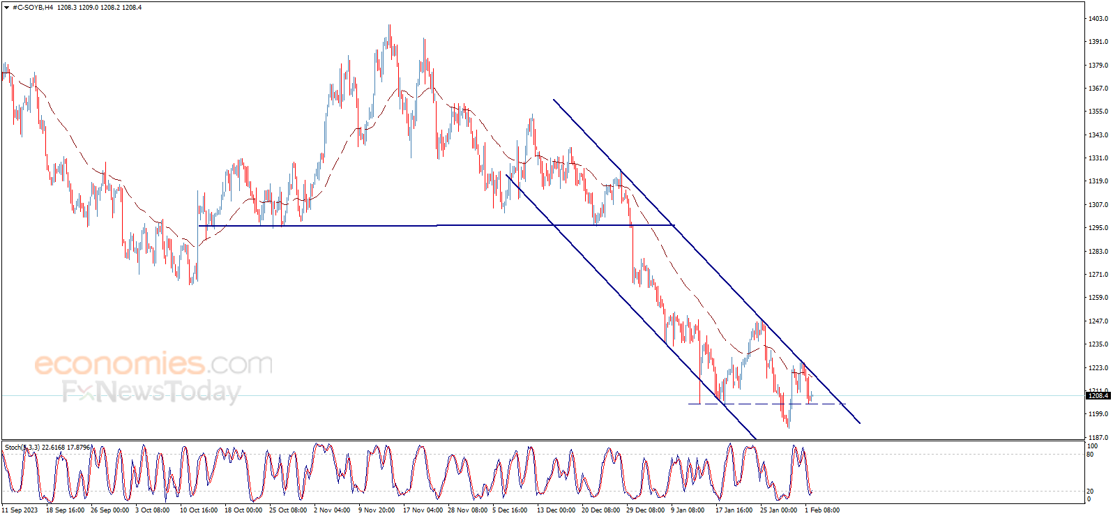 ارتدت تداولات سعر فول الصويا هبوطاً بعد اختبار مقاومة القناة الهابطة التي تظهر بالرسم البياني، لينجح بملامسة هدفنا الأول عند 1204.10 ويستقر عنده، بانتظار كسر هذا المستوى لتأكيد امتداد الموجة الهابطة ضمن القناة المذكورة والتوجه نحو 1171.50 كهدف تالي.