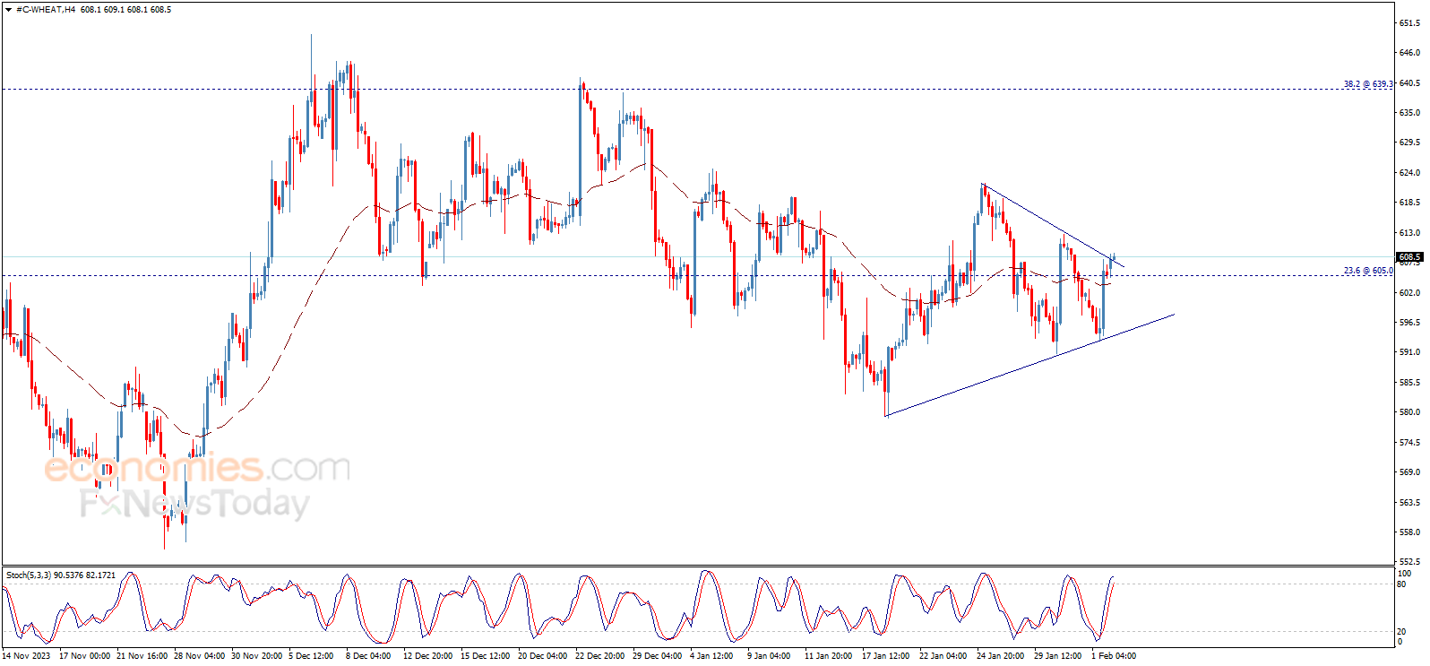 اندفع سعر القمح صعوداً يوم أمس ليخترق مستوى 605.00 ويستقر فوقه، ويبدأ اليوم بارتفاع إضافي ليبتعد عن هذا المستوى ويؤكد التحوّل إلى الارتفاع على المدى اللحظي، في طريقه لتحقيق مكاسب تبدأ عند 620.00 وتمتد إلى 639.30.