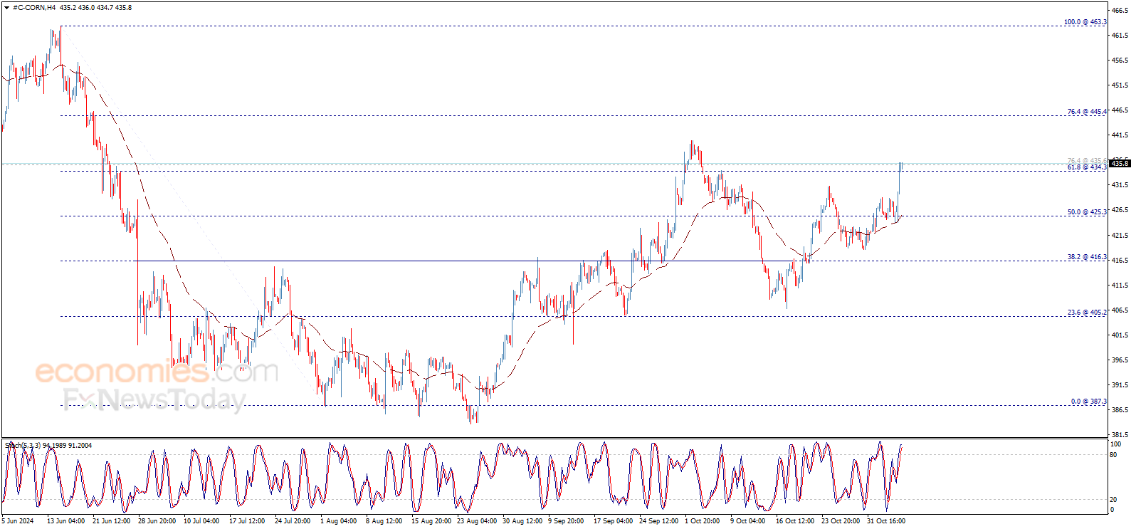 اندفع سعر الذرة صعوداً بشكل قوي يوم أمس لينجح بتحقيق هدفنا المنتظر عند 434.30$، ونلاحظ أن السعر اخترق هذا المستوى وأغلق الشمعة اليومية الأخيرة فوقه، معززاً التوقعات باستمرار الاتجاه الصاعد خلال الجلسات القادمة، مع الإشارة إلى أن الهدف التالي يصل إلى 445.40$.