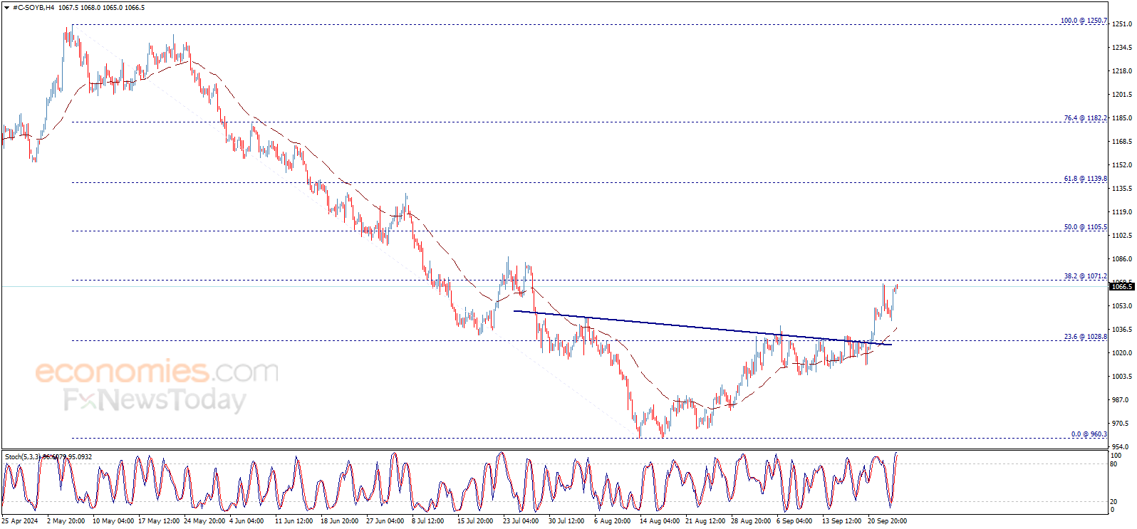 استأنف سعر فول الصويا تداولاته الإيجابية ليصل إلى مستوى 1071.20$ من جديد، بانتظار اختراق هذا المستوى لتأكيد امتداد الموجة الصاعدة وتحقيق مكاسب إضافية تصل إلى 1105.50$، حيث يتأثر السعر بنموذج الرأس والكتفين المقلوب المكتمل مسبقاً.