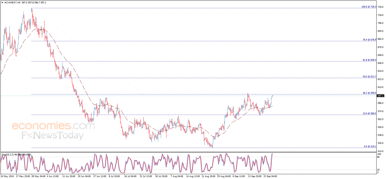 ارتفع سعر القمح بشكل ملحوظ يوم أمس ليصل إلى الهدف المنتظر عند 599.00$، ونتوقّع اختراق هذا المستوى لإجراء مزيد من التصحيح الصاعد خلال الفترة القادمة، حيث يصل الهدف التالي إلى مناطق 623.70$.