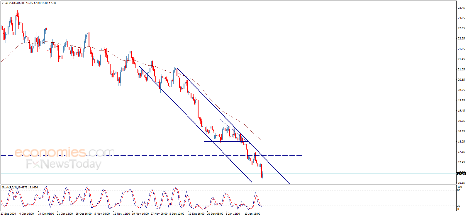 يستمر سعر السكر بالانخفاض ليستقر عند حاجز 17.00$، معززاً التوقعات باستمرار الاتجاه الهابط، منتظماً داخل القناة الهابطة التي تملك أهداف سلبية تصل إلى 16.65$ ثم 16.20$.