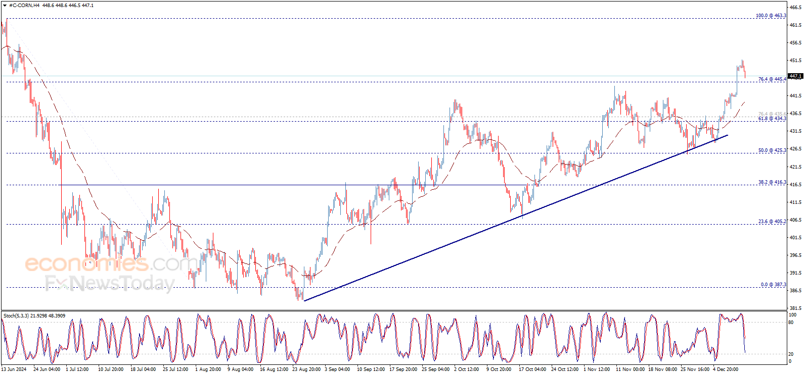 يظهر سعر الذرة بعض الميل الهابط ليقترب من اختبار الدعم المحوري 445.40$، ونلاحظ أن مؤشر ستوكاستيك تخلّص من سلبيته ليصل إلى مناطق التشبع في البيع، بانتظار تحفيز السعر على استئناف الاتجاه الصاعد المتوقع على المدى اللحظي والقصير، مع التذكير بأن الهدف التالي يتواجد عند 463.30$.