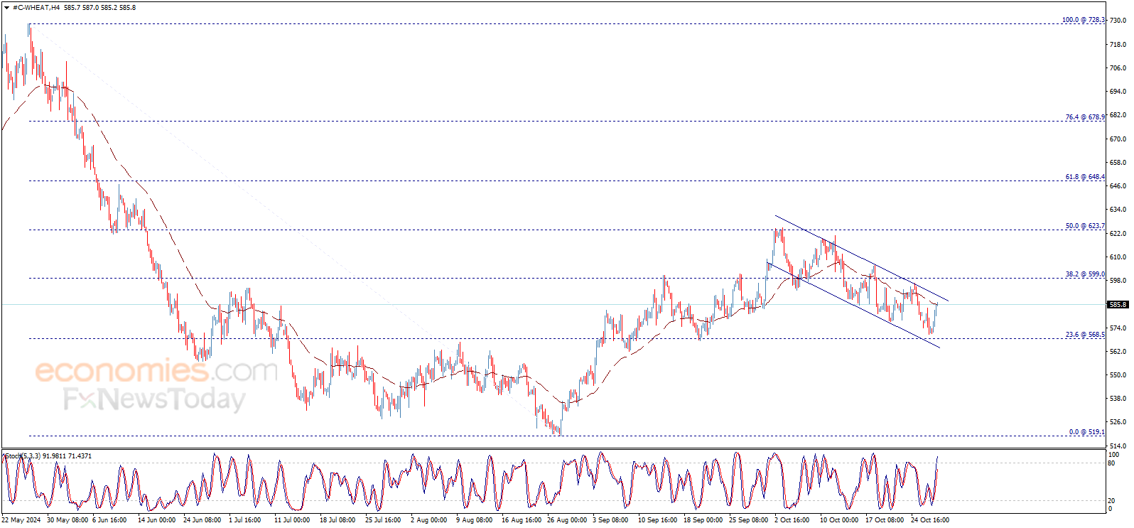 وصل سعر القمح بفارق نقاط قليلة عن هدفنا المنتظر عند 568.50$، وارتد صعوداً بشكل ملحوظ من هناك ليحقق بعض المكاسب اللحظية، حيث يصل إلى مقاومة القناة اللحظية الهابطة، بالتزامن مع فقدان مؤشر ستوكاستيك للعزم الإيجابي بشكل واضح، بانتظار تحفيز السعر على استئناف الاتجاه الهابط المتوقع للفترة القادمة، مع الإشارة إلى أن كسر 568.50$ سيمد الموجة الهابطة لتصل إلى 555.60$.