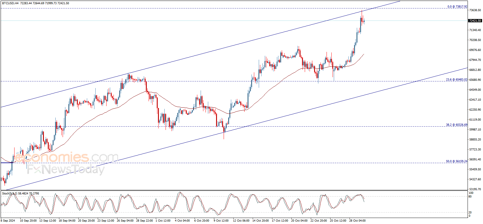 وبالتالي، نحن مستمرون بترجيح الاتجاه الصاعد، مع الأخذ بعين الاعتبار أن كسر 70556.50$ سيوقف الاندفاع الصاعد ويضغط على السعر لإجراء بعض التصحيح الهابط قبل العودة للارتفاع من جديد. |