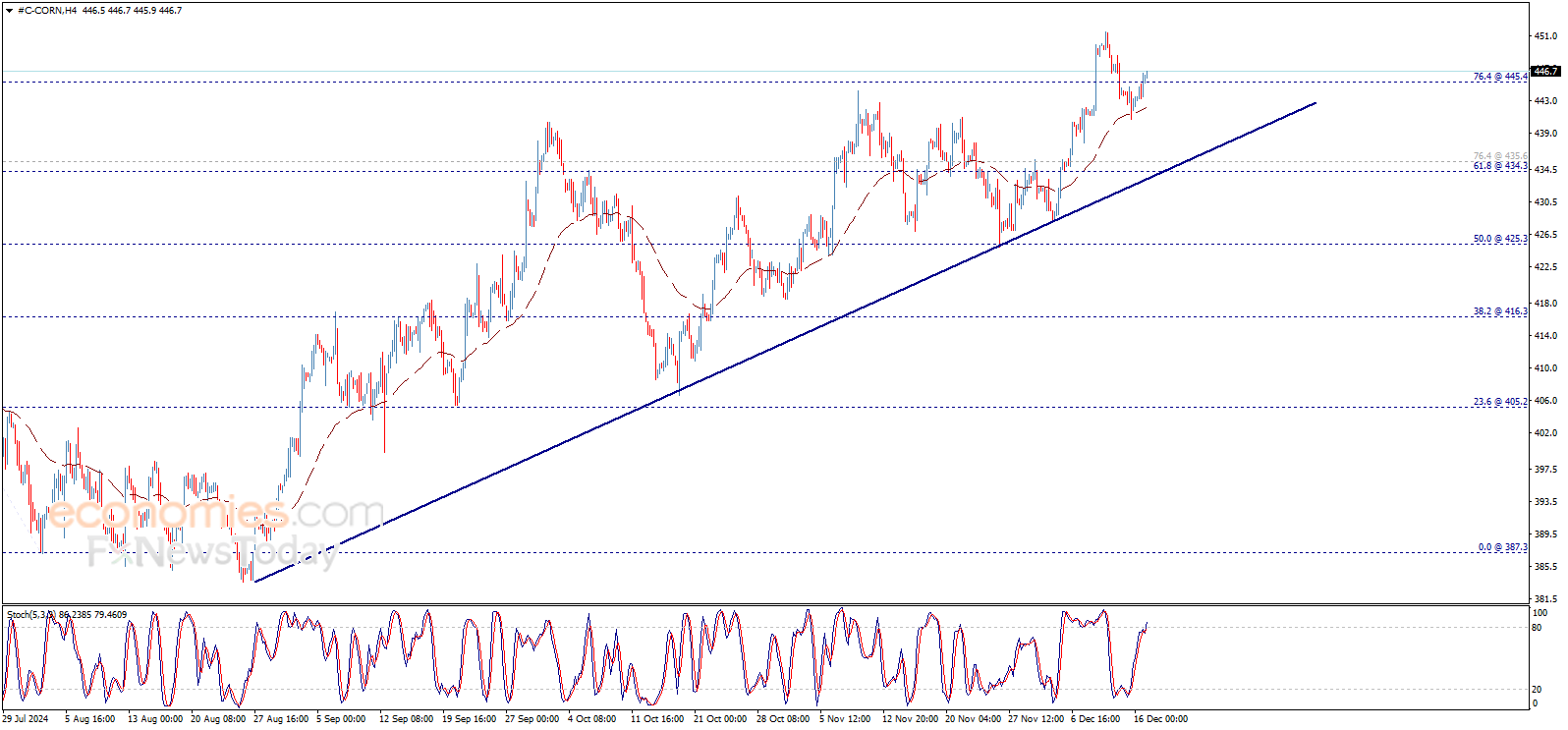 أنهى سعر الذرة تداولات يوم أمس فوق مستوى 445.40$، ليقدّم إشارات على التوجه لبناء موجة صاعدة جديدة على المدى اللحظي، لكننا نلاحظ أن مؤشر ستوكاستيك يظهر تشبّع كبير في الشراء، مما قد يضع السعر تحت ضغط سلبي خلال الجلسات القادمة.