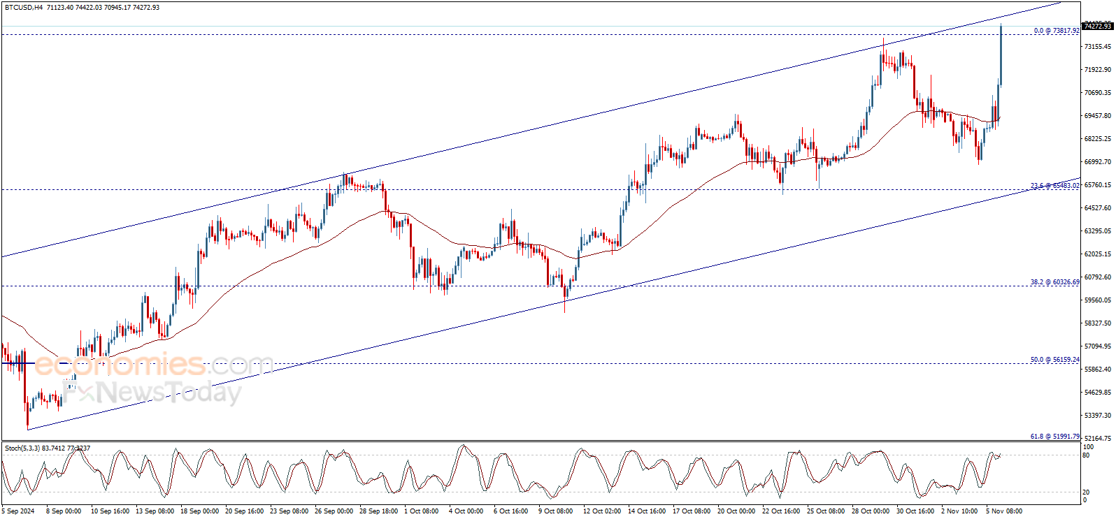 افتتح سعر البتكوين (BTCUSD) تداولات اليوم باندفاع صاعد قوي ليبدأ بتسجيل مستويات تاريخية جديدة، حيث تخطّى مستوى 73817.90$ ليتجه نحو تحقيق أهداف إيجابية نتوقّع أن تصل إلى مناطق 76000.00$ ثم 77500.00$ كمحطات إيجابية تالية.