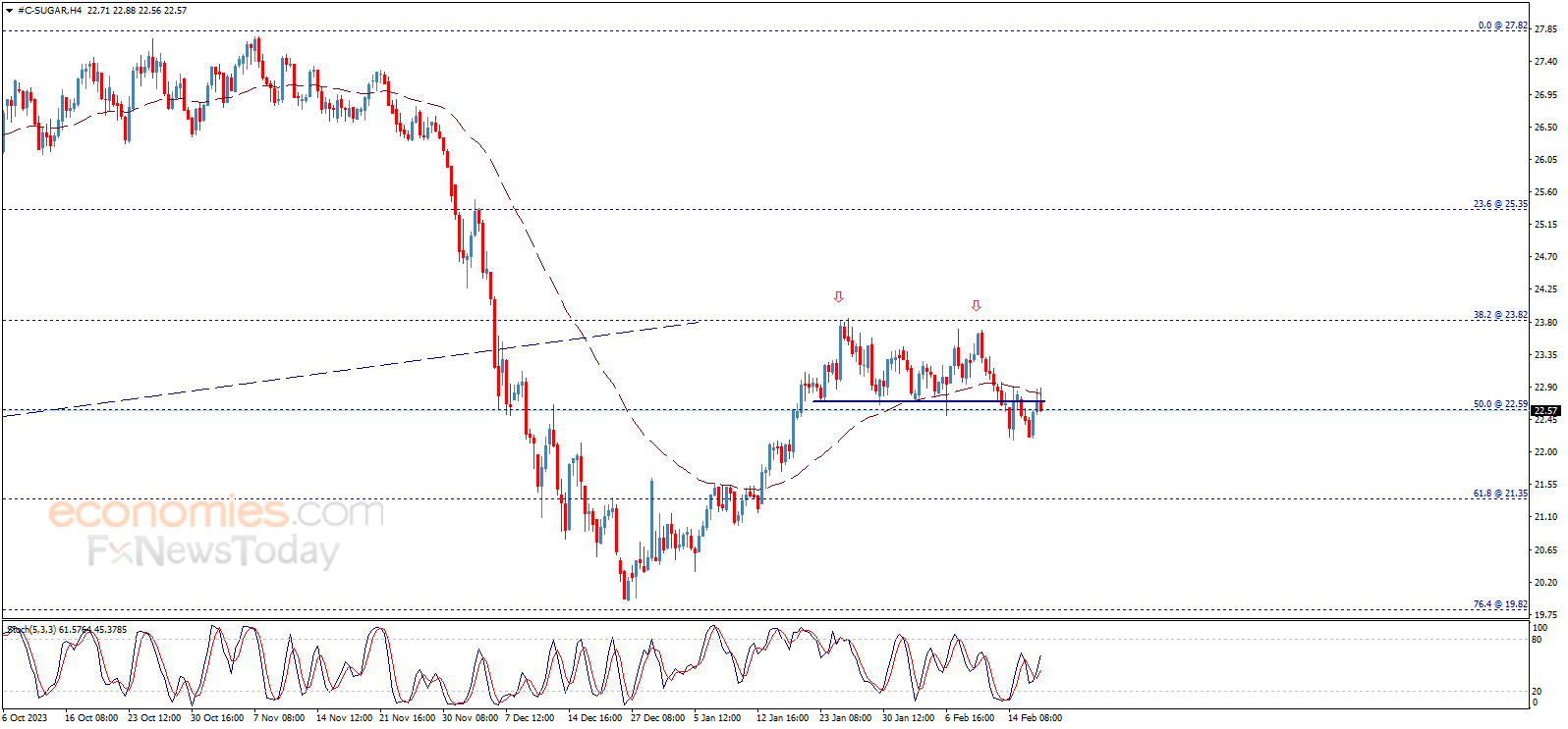 أجرى سعر السكر عملية إعادة اختبار لخط الرقبة المكسور لنموذج القمة المزدوجة ويحافظ على ثباته دونه، ليبقى سيناريو الاتجاه الهابط فعالاً للفترة القادمة، بانتظار التوجه نحو 21.35 الذي يمثّل هدفنا الرئيسي التالي.