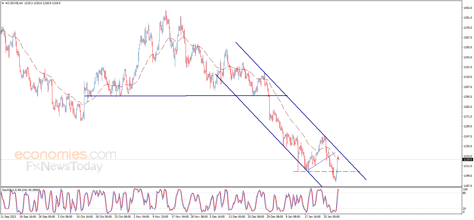 تداول سعر فول الصويا بإيجابية قوية يوم أمس ليخترق مستوى 1204.10 ويقترب من مقاومة القناة الهابطة التي تظهر بالرسم البياني، ونلاحظ أن المتوسط المتحرك 50 يشكل مقاومة قوية أمام السعر، بينما يفقد مؤشر ستوكاستيك عزمه الإيجابي ليظهر تشبع واضح في الشراء الآن.