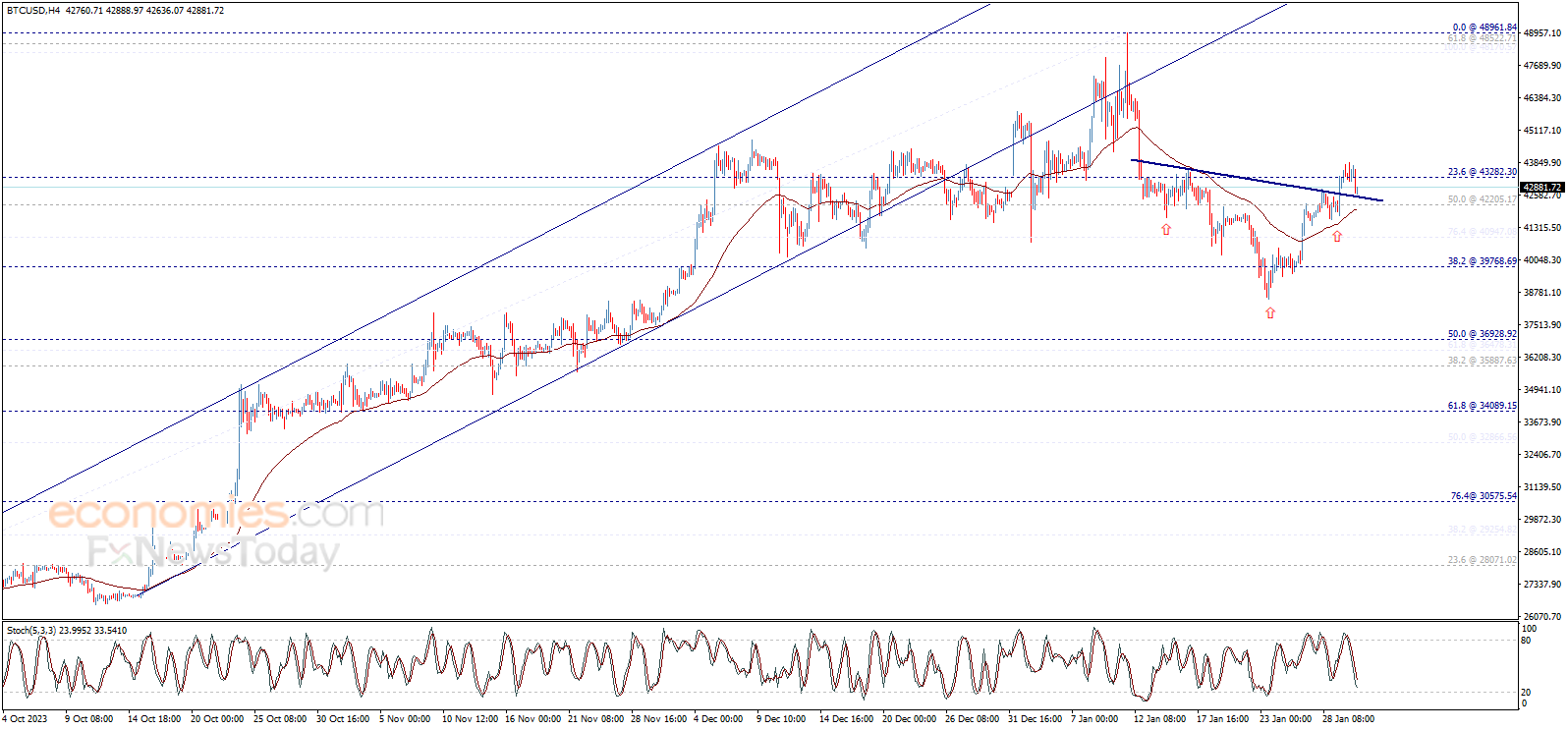 وبالتالي، نحن نتوقّع أن يستأنف السعر الموجة الصاعد التي تستهدف مناطق 46770.00 كمحطة رئيسية تالية، مع الانتباه إلى أن كسر 42205.20 سيوقف الارتفاع المتوقع ويضغط على السعر للعودة إلى المسار التصحيحي الهابط من جديد.
