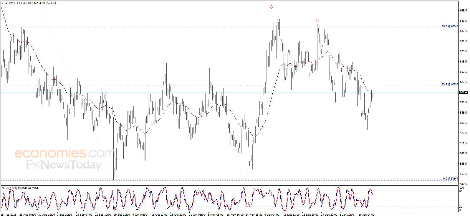 ارتدت تداولات سعر القمح صعوداً ليقترب من إعادة اختبار خط الرقبة المكسور لنموذج القمة المزدوجة الذي يظهر بالرسم البياني، ونلاحظ أن المتوسط المتحرك 50 يشكّل عائق أمام المحاولات الإيجابية، بانتظار استئناف الاتجاه الهابط المتوقع على المدى اللحظي، والذي يستهدف مستوى 573.00 بشكل رئيسي.
