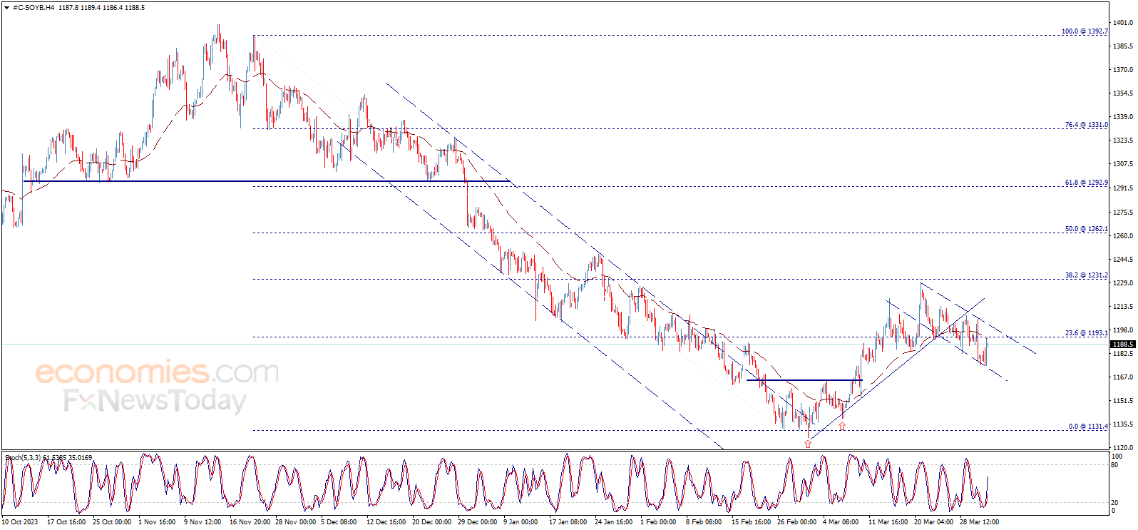 قدّم سعر فول الصويا تداولات إيجابية يوم أمس ليختبر المقاومة المحورية 1193.10$، ويحافظ السعر على ثباته دون هذا المستوى ليبقى سيناريو الاتجاه الهابط قائماً للفترة القادمة، يدعمه المتوسط المتحرك 50 الذي يلتقي مع المستوى المذكور ليضيف مزيد من القوة إليه.