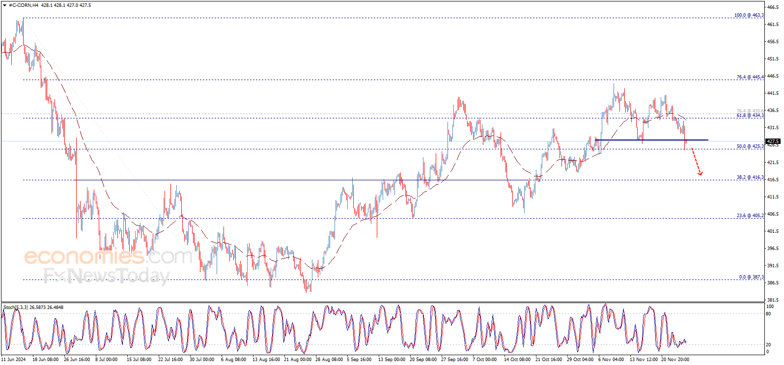 تمكّن سعر الذرة من تحقيق هدفنا السلبي المنتظر عند 425.30$، وبتدقيق النظر في الرسم البياني، نجد بأن السعر أكمل تشكيل نموذج قمة مزدوجة نتوقّع أن يدفع السعر لكسر المستوى المذكور ومن ثم فتح الطريق أمام التوجه نحو 416.30$ كهدف سلبي تالي.
