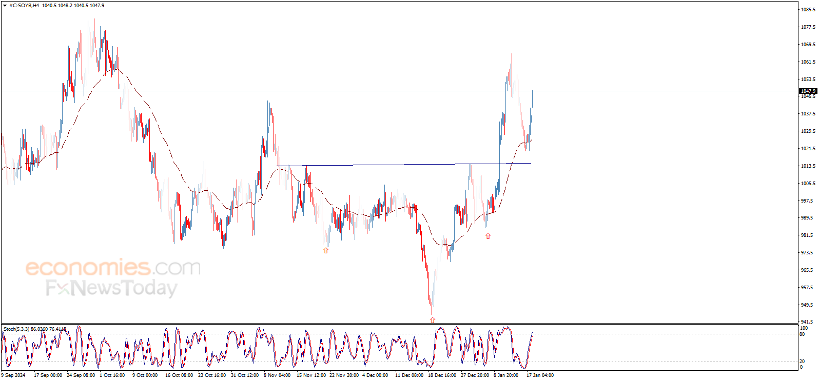 ارتدت تداولات سعر فول الصويا صعوداً بشكل ملحوظ بعد الاقتراب من الهدف السلبي المقترح في تقريرنا الأخير عند 1014.50$، ليستأنف الاتجاه الصاعد على المدى اللحظي والقصير، متأثراً بنموذج الرأس والكتفين المقلوب المكتمل مسبقاً، بانتظار زيارة مستويات 1080.00$ كمحطة رئيسية تالية.