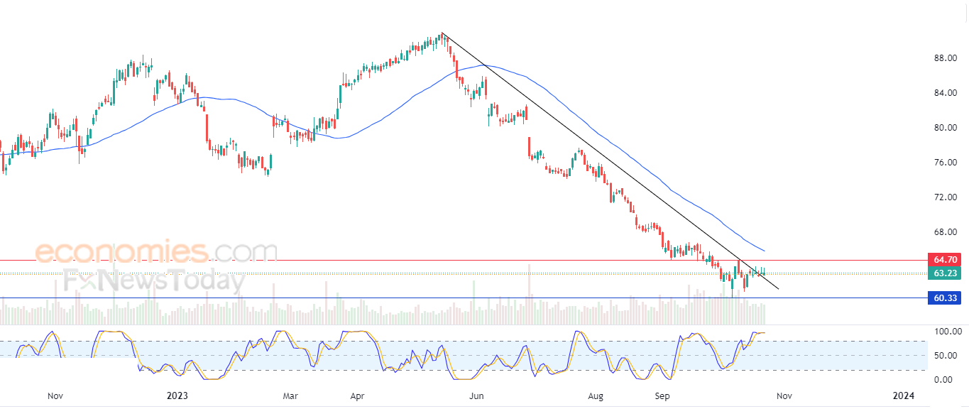 لهذا نحن نتوقع المزيد من الانخفاض للسهم خلال تداولاته القادمة، طيلة استقراره دون مستوى المقاومة 64.70، ليستهدف مستوى الدعم 60.33.