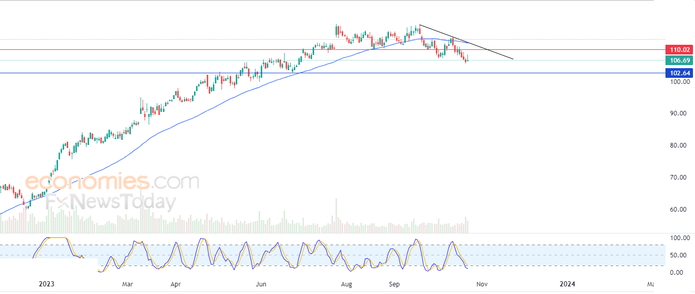 لذلك تشير توقعاتنا إلى ترجيح سيناريو عودة انخفاض السهم خلال تداولاته القادمة، طيلة استقراره دون مستوى 110.00، ليستهدف مستوى الدعم 102.65.