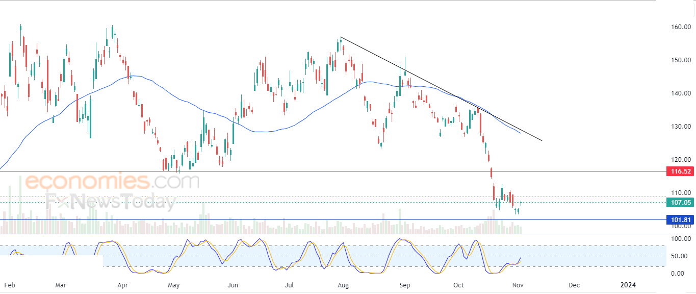 لذلك تشير توقعاتنا إلى ترجيح سيناريو عودة انخفاض السهم خلال تداولاته القادمة، طيلة ثبات المقاومة 116.50، ليستهدف مستوى الدعم 101.80.