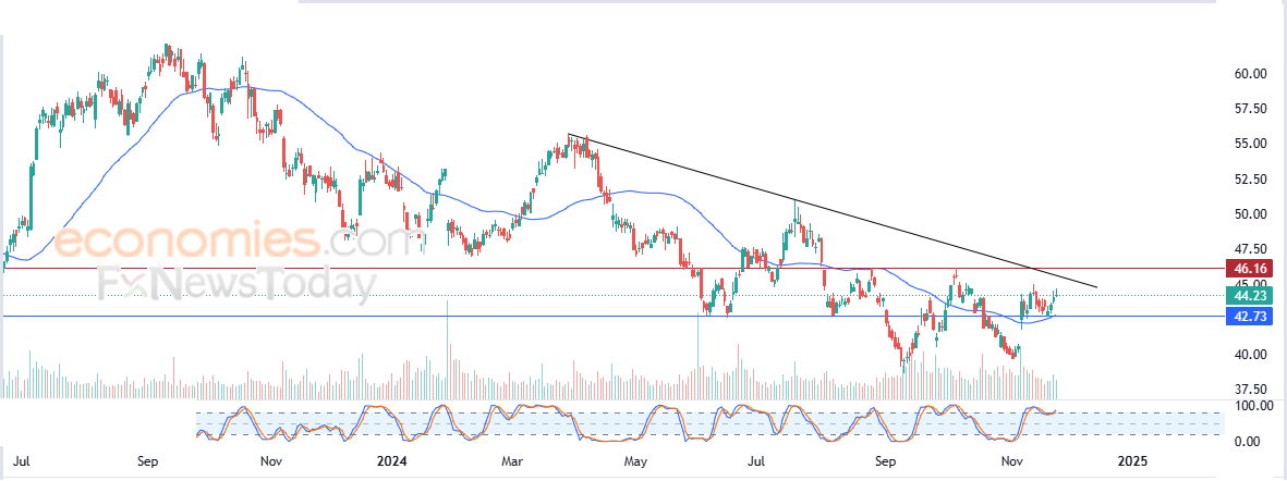 لذلك نحن نرجح عودة هبوط سعر السهم خلال تداولاته القادمة، طيلة ثبات مستوى المقاومة 46.16$، ليستهدف من جديد مستوى الدعم 47.73$.