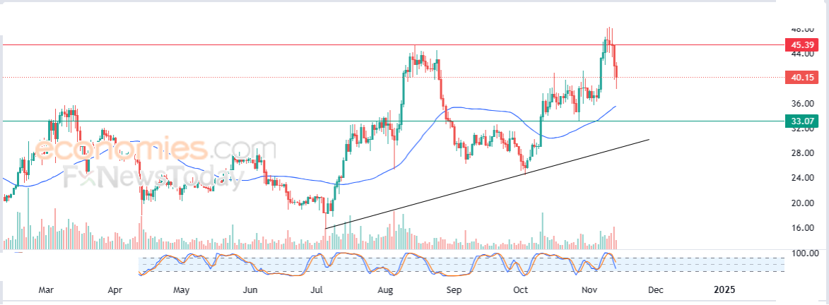 لهذا تشير توقعاتنا إلى ترجيح سيناريو عودة صعود سعر العملة خلال تداولاته القادمة، طيلة ثبات مستوى الدعم 33.00، ليستهدف من جديد مستوى المقاومة المحوري والعنيد 45.40.