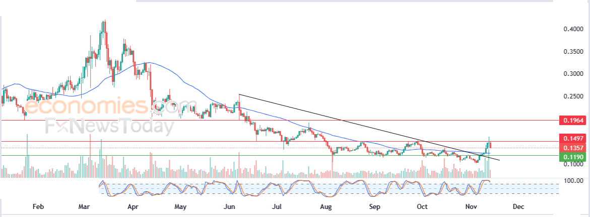 لذلك نحن نرجح عودة صعود سعر العملة خلال تداولاته القادمة، خاصة في حالة اختراقه للمقاومة 0.1497، ليستهدف بعدها مستوى المقاومة 0.1964.