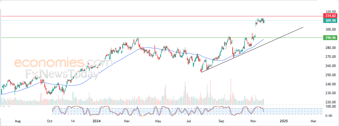 لهذا فتوقعاتنا تشير إلى المزيد من الارتفاع لسعر السهم خلال تداولاته القادمة، ليستهدف مستوى المقاومة القريب 314.60$ استعداداً لمهاجمته.