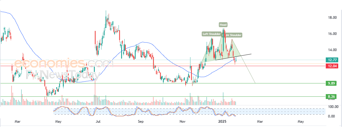 لهذا فتوقعاتنا ترجح عودة هبوط سعر السهم خلال تداولاته القادمة، خاصة في حالة كسره للدعم السابق ذكره 12.04$، ليستهدف بعدها مستوى الدعم المهم 9.90$ كمستهدف سعري لنموذج الرأس والكتفين المتكون.