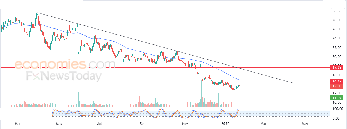 لذلك نحن نتوقع المزيد من الهبوط لسعر السهم خلال تداولاته القادمة، خاصة طوال استقراره دون مستوى المقاومة 14.42$، ليستهدف مستوى الدعم 11.00$.