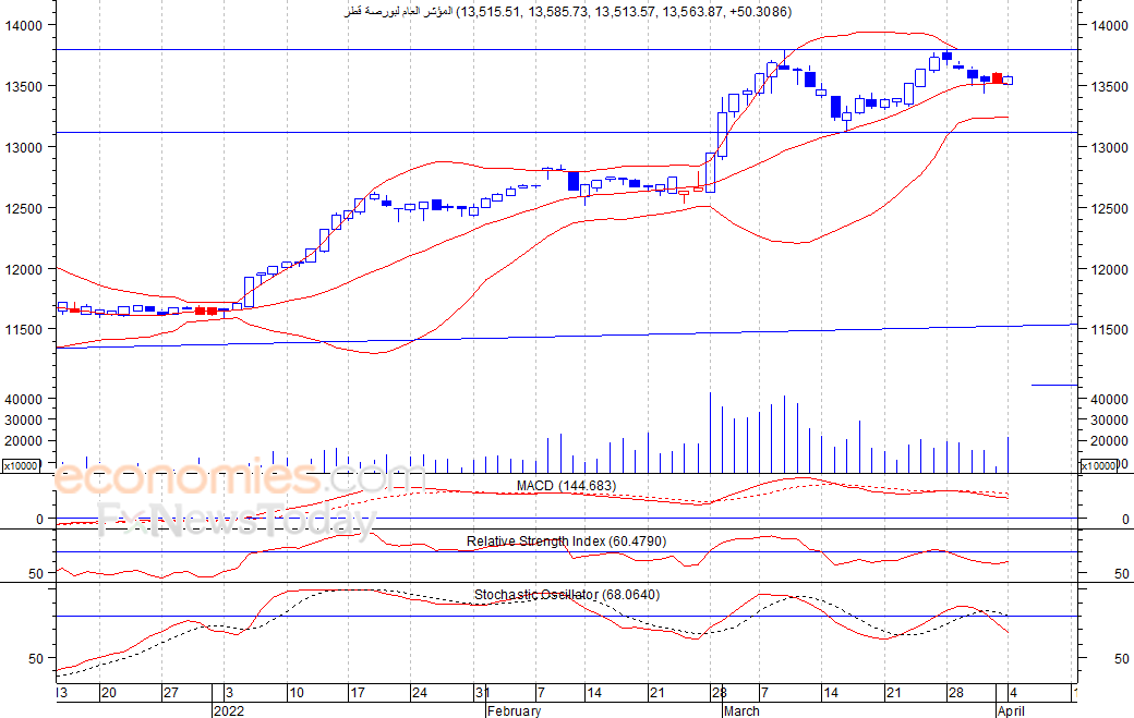 شهد المؤشر ارتفاعا خلال جلسة امس الاثنين، حيث اغلق عند مستوى 13563نقطة، مصحوبا بارتفاع في كمية التداول، في ظل استمرار الاداء السلبي على المؤشرات الفنية مثل مؤشر استوكاستيك والذي يشير الى امكانية انخفاض المؤشر مرة اخرى للوصول لمستوى الدعم 13100 نقطة، شرط عدم تجاوز المؤشر مستوى 13800نقطة.