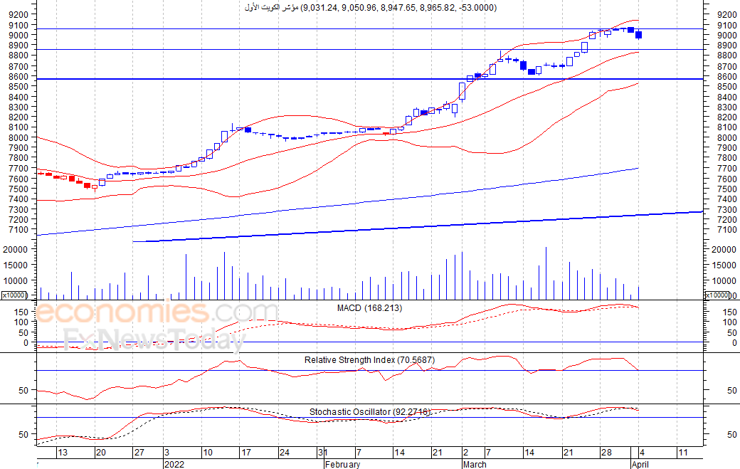 انهى المؤشر تداولات امس الاثنين في المنطقة الحمراء، حيث اغلق عند مستوى 8965 نقطة، وهو ادنى مستوى يصل اليه المؤشر في اسبوع، كما نلاحظ انطلاق اشارة بيع على مؤشر ماكد، لذلك نتوقع ان يشهد المؤشر مزيدا من عمليات جني الارباح في الاجل القصير للوصول لمستوى الدعم 8800 نقطة كمستوى اول ثم 8600 نقطة كمستوى ثان، شرط بقاء المؤشر اسفل مستوى 9100 نقطة.