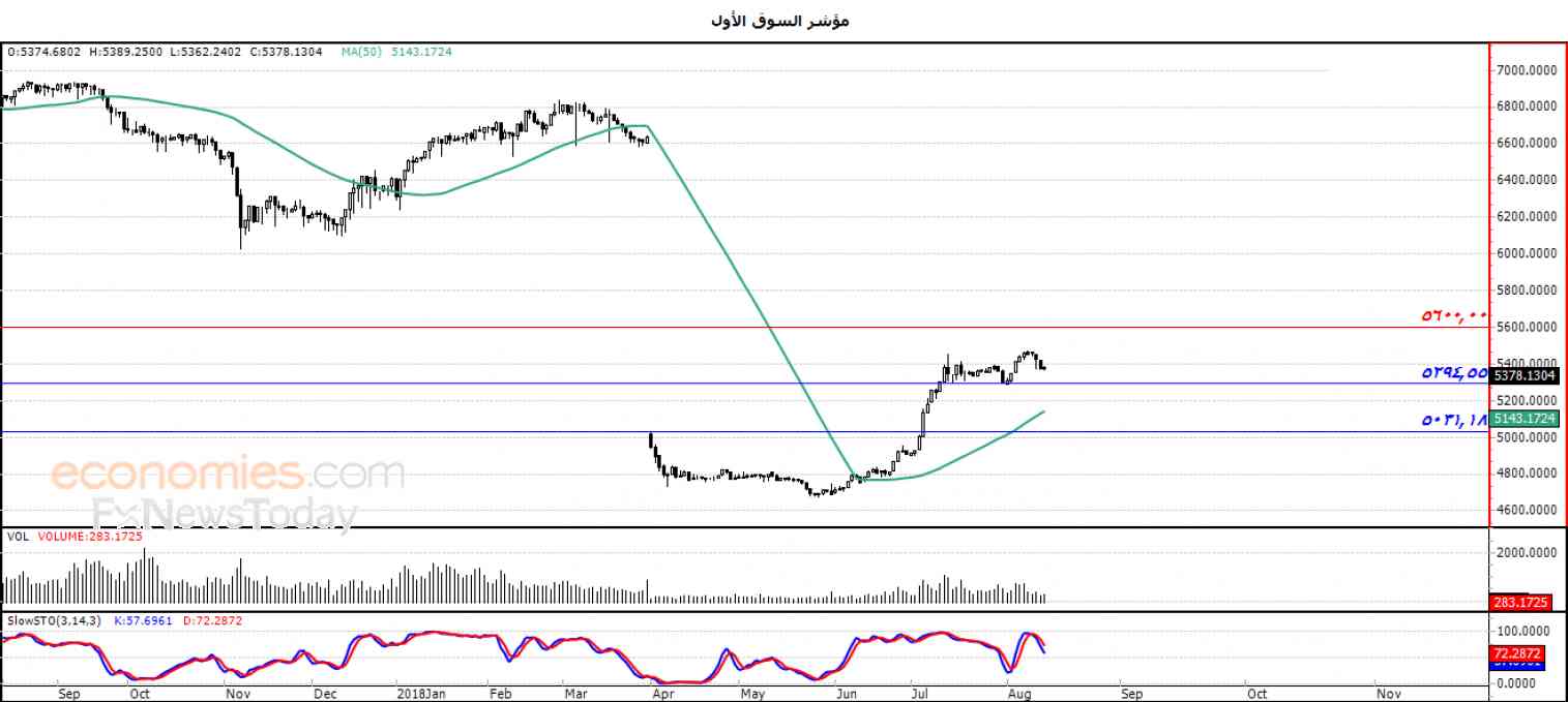 نطاق التداول المتوقع لهذا اليوم ما بين مستوى الدعم 5294.55 ومستوى المقاومة 5600.00 .