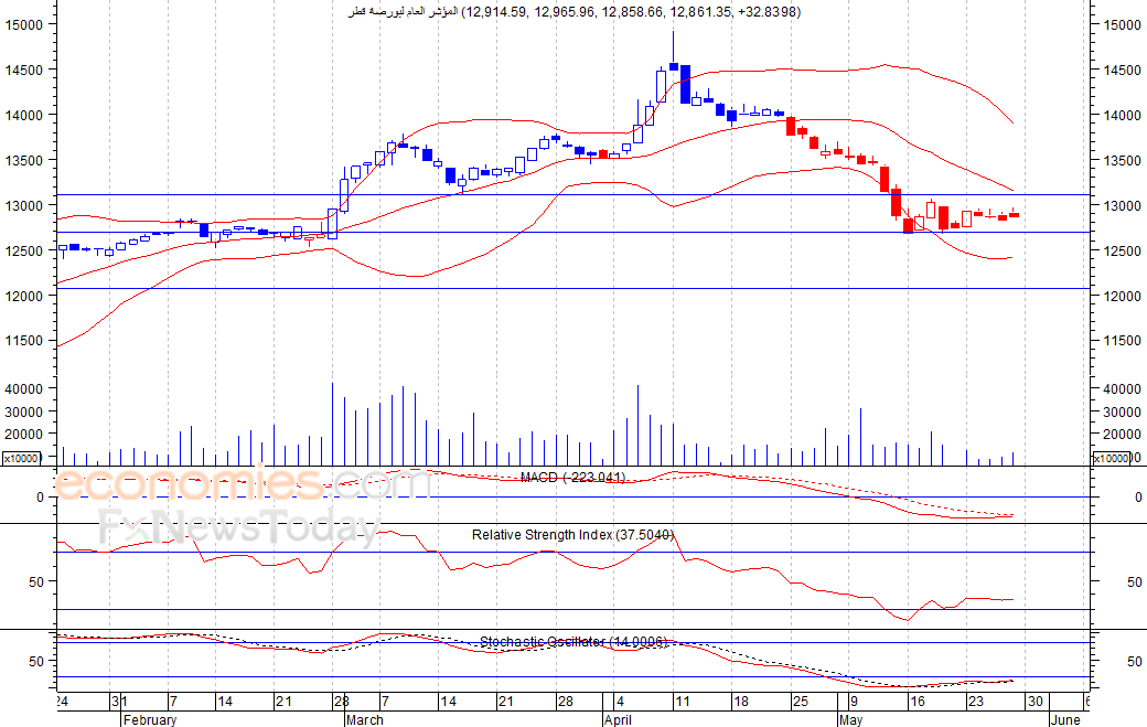 قلص المؤشر مكاسبه التي حققها خلال جلسة امس الاحد، حيث استهل الجلسة مرتفعا عند مستوى 12914 نقطة، الا انه اغلق عند مستوى 12861 نقطة، في ظل تقارب كمية التداول من متوسطها الاسبوعي، ولا تعكس المؤشرات الفنية اي اشارت ذات اهمية، لذلك نتوقع ان يتحدد الاتجاه القادم للمؤشر باختراقه مستوى 13100 او 12700 نقطة.