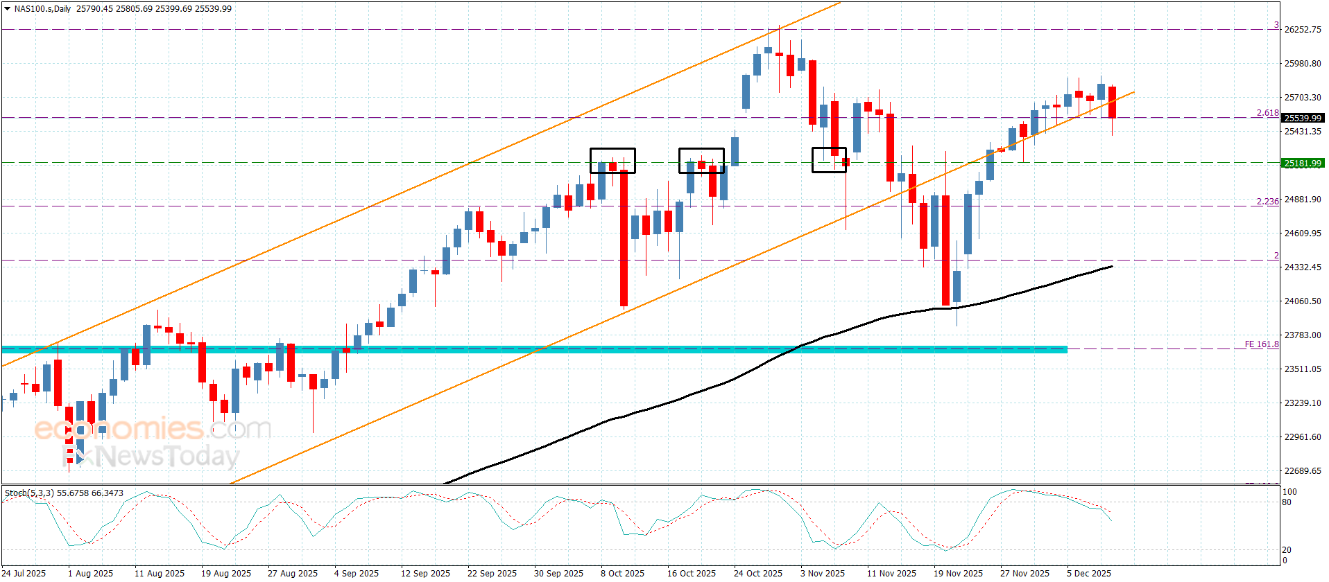 سجّل سعر المؤشر بتداولات يوم أمس بعض المكاسب بملامسته لمستوى 25880.00 إلا أن الثبات المتكرر دون الحاجز المستقر عند 25970.00 دفع به لتأجيل الهجوم الصاعد والبدء بتشكيل موجات تصحيحية سلبية لنلاحظ استهدافه بتداولات هذا الصباح لمستوى 25400.00.