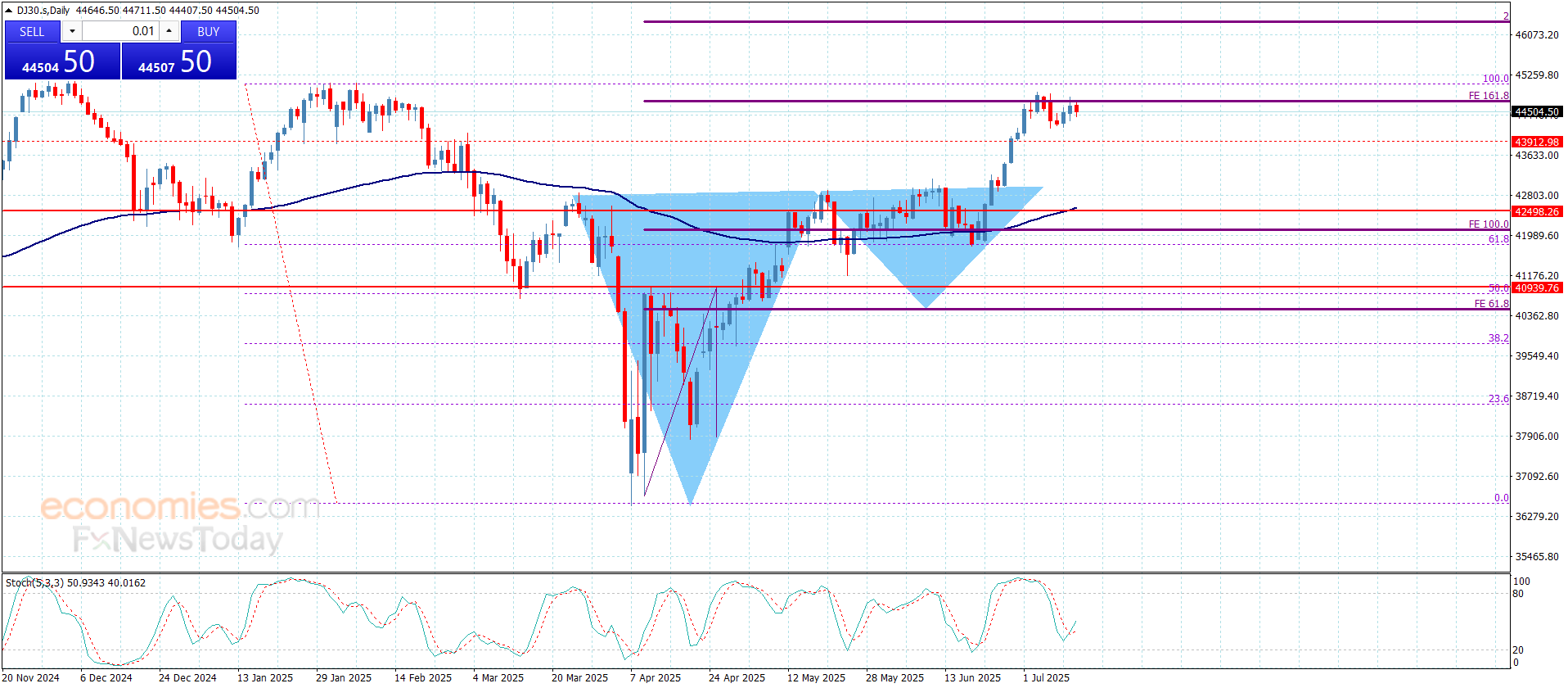 شكّل سعر المؤشر بتداولات يوم أمس اندفاع صاعد جديد ليقترب من الهدف المتمركز عند 44860 بفارق قليل ومن ثم ليضطر لتفعيل المسار التصحيحي الهابط بتسلله حاليا نحو 44400 نتيجة لافتقاره للعزم الإيجابي باستمرار تذبذب مؤشر ستوكاستيك دون مستوى 50.
