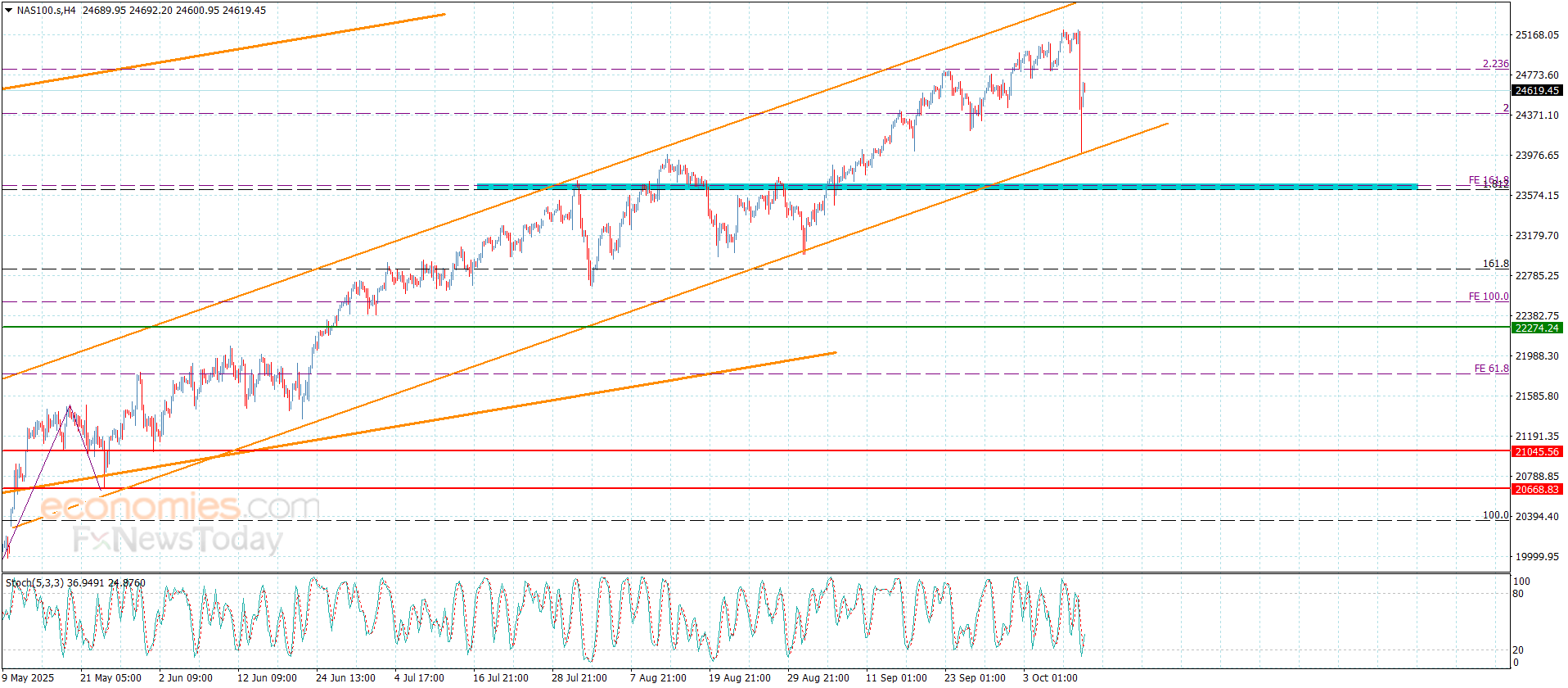 شكّل سعر المؤشر بتداولات يوم الجمعة هجوم تصحيحي هابط قوي لنلاحظ اختباره بذلك لدعم القناة الصاعدة الممتد نحو 23990.00 ومن ثم ليفتتح تداولات هذا الصباح بفجوة سعرية كبيرة معوضا بذلك جزء كبير من خسائره باندفاعه نحو 24650.00.